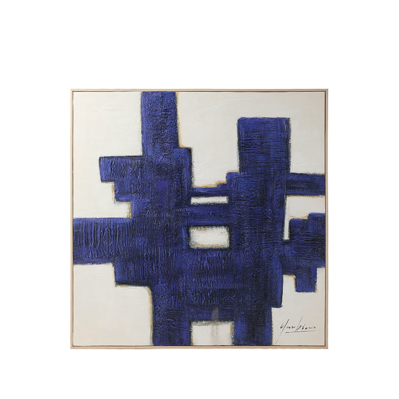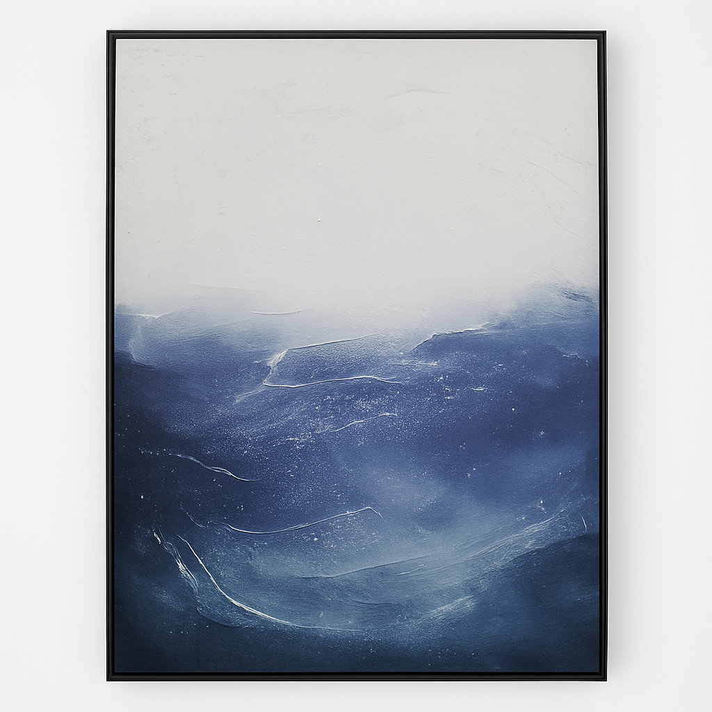 انغمس في عمق الفن مع هذه اللوحة التجريدية الساحرة بألوان الأزرق الداكن والأبيض، التي تجسد...
