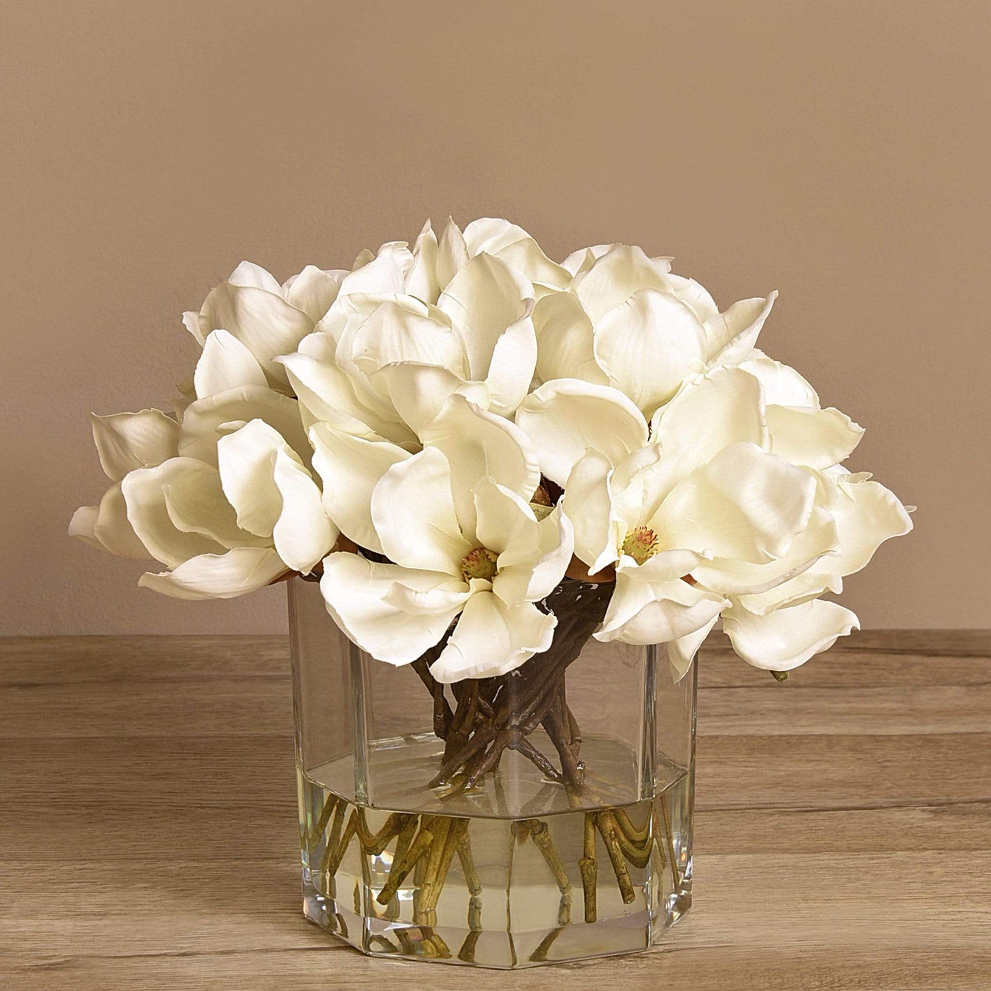 زهور ماغنوليا بيضاء صناعية أنيقة في مزهرية زجاجية عصرية، مثالية لإضافة لمسة جمالية دائمة