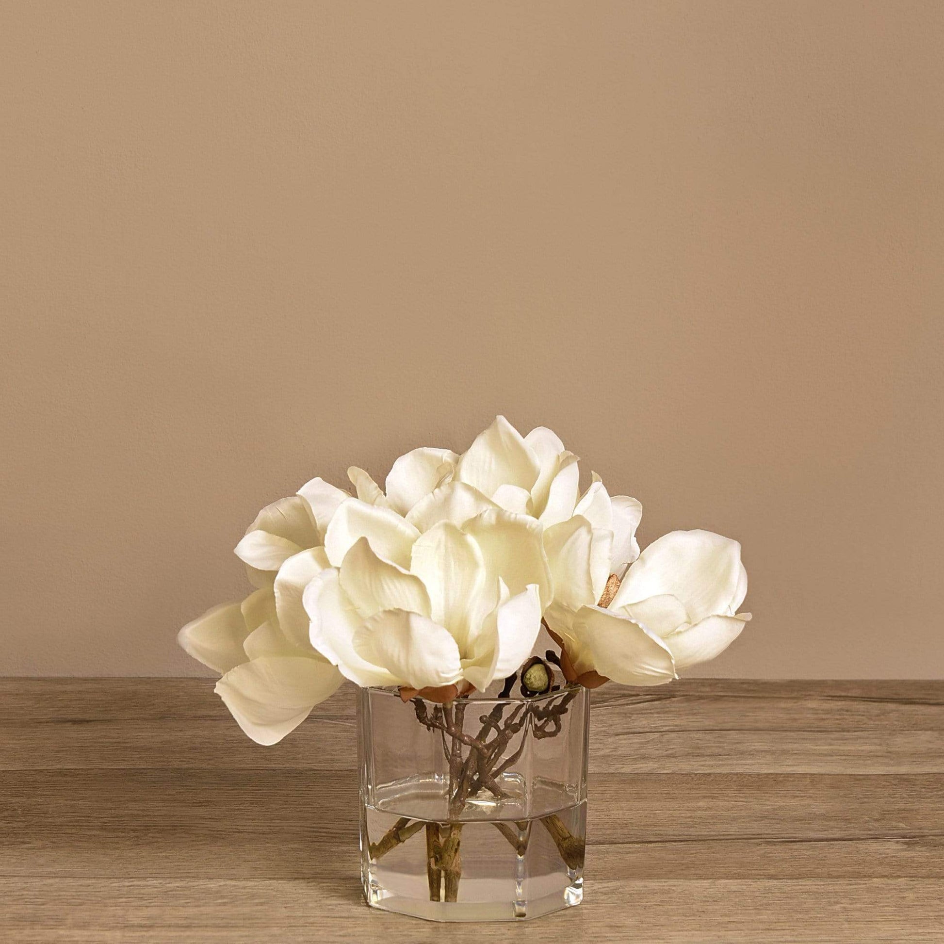 زهور ماغنوليا بيضاء صناعية أنيقة في مزهرية زجاجية عصرية، مثالية لإضافة لمسة جمالية دائمة